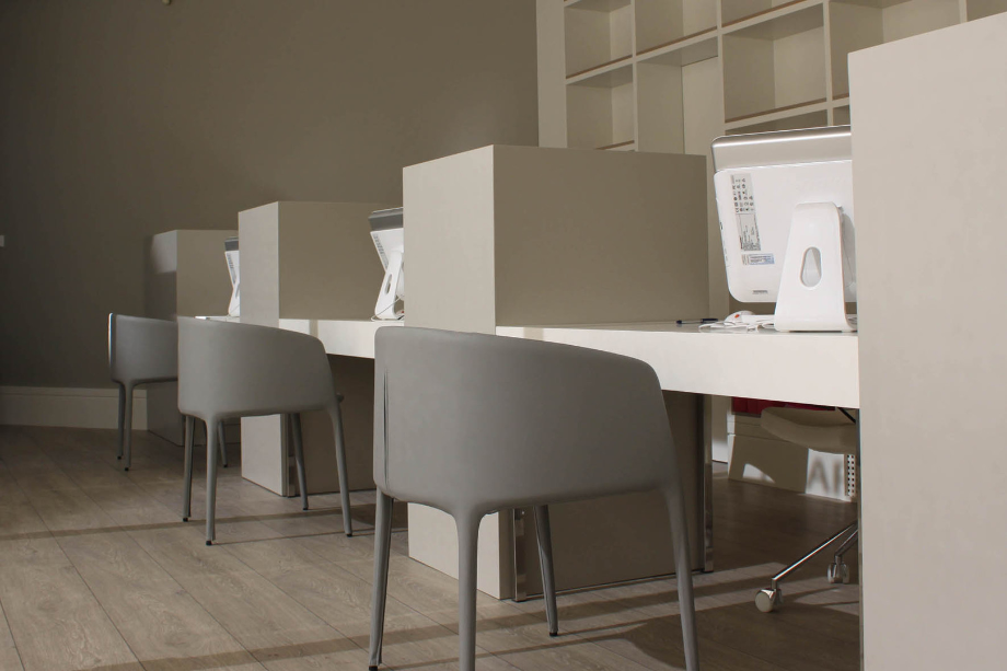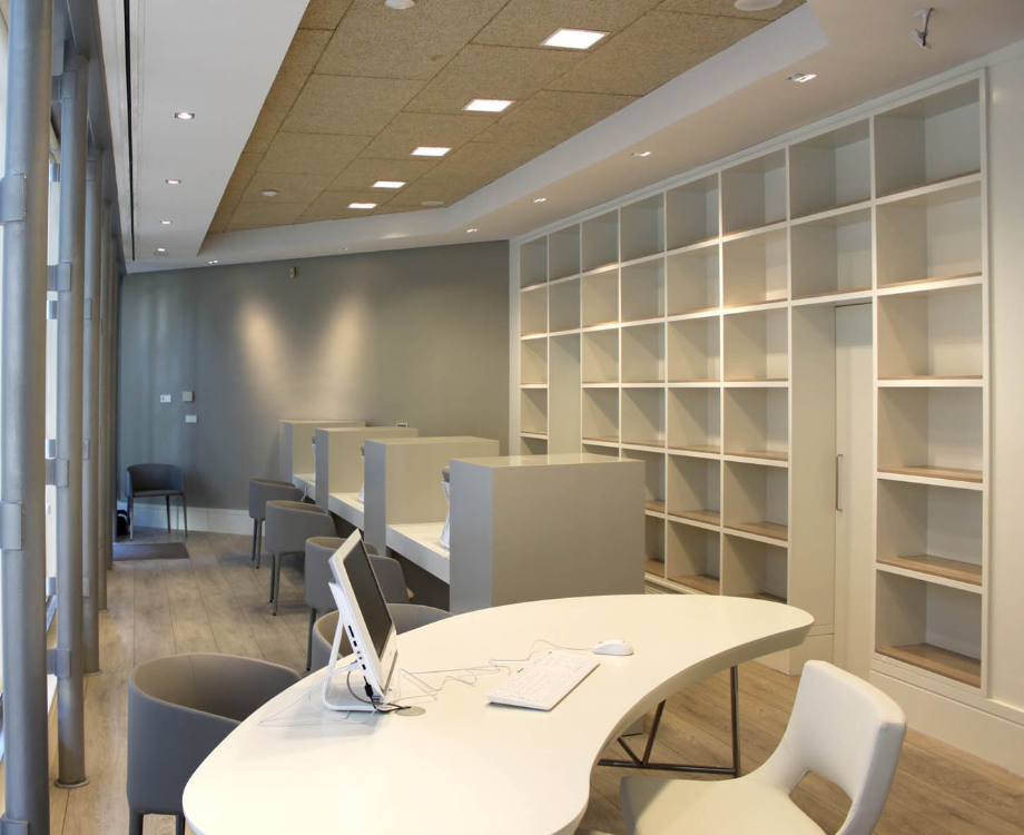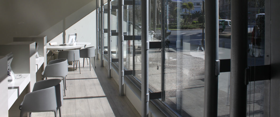 Reforma de local de atención al público para empresa de eventos, congresos y viajes en un espacio de proporciones muy singulares Se consigue dotar a los distintos puestos de atención de la suficiente independencia a pesar de la proximidad. Todo el mobiliario salvo los asientos se ha diseñado y fabricado por nuestra firma.